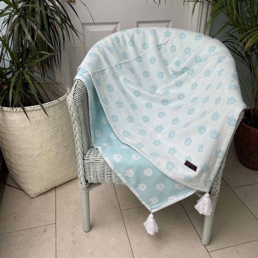 This beautiful rose pattern jacquard brushed cotton throw in a lovely soft duck egg blue on a cream back ground.