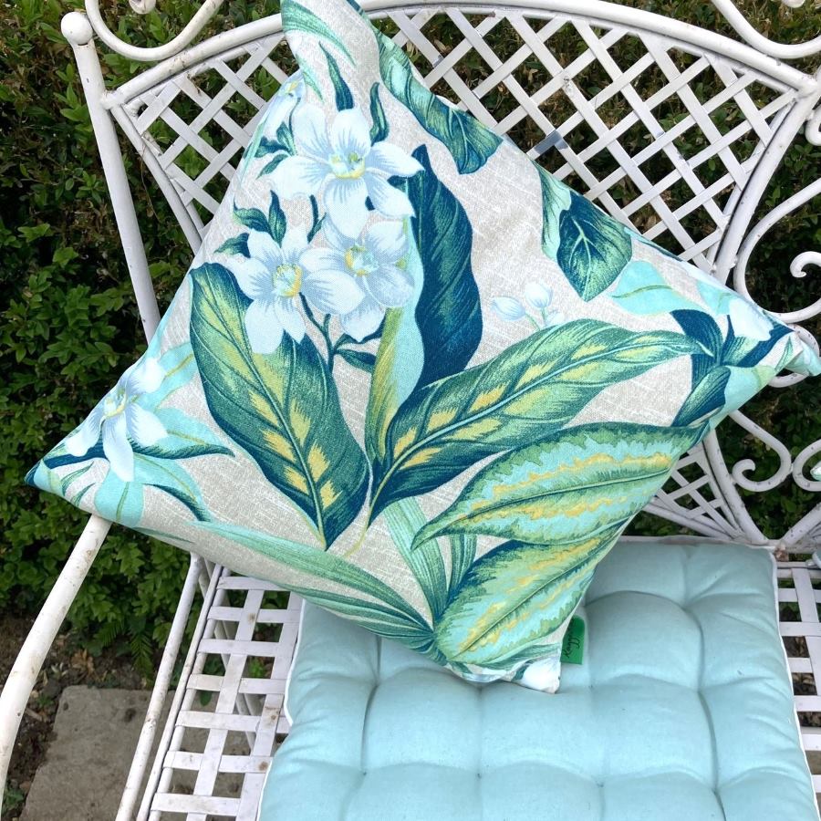 This gorgeous Frangipani green showerproof cushion will some exotic vibe to your patio this summer.