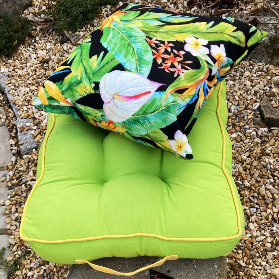 A contrasting colour has been used for the carry strap in a sunny gold. The cotton fabric used for the rest of the cushion is a zingy lime green colour way. This will certainly make your Lime Garden Floor Cushion stand out from a crowd!