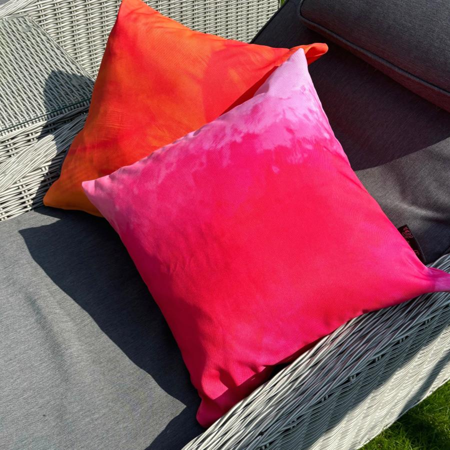 Being weather resistant this stunning design incorporates fabulous shades of soft pink , through to a deeper fuchsia pink. This print technique is an updated version of the old tie look from years ago. It looks as if there are pink clouds in the sky which is part of the effect.These cushions will look glorious in the garden or by the pool.