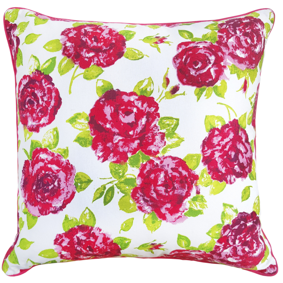 Our beautiful Polly pink rose cushion features our signature Ragged Rose floral design on both sides with matching bright pink piping.
