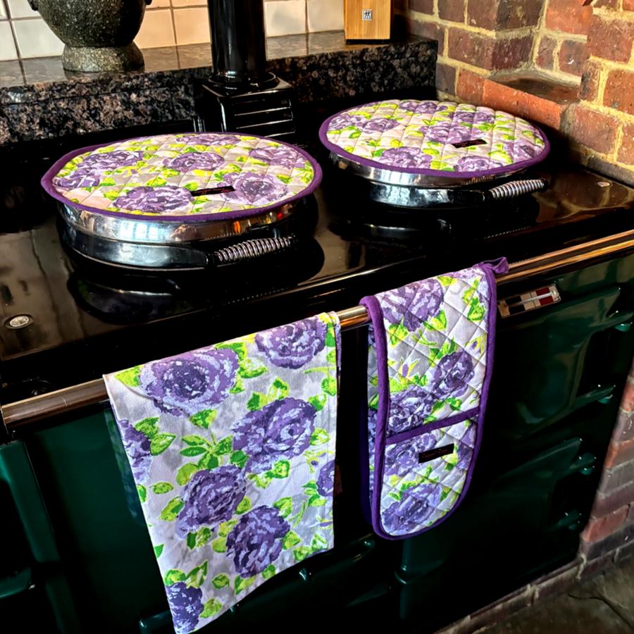 Take a look at our other purple floral products including the matching Betty apron and oven gloves to complete the purple rose story in your kitchen .