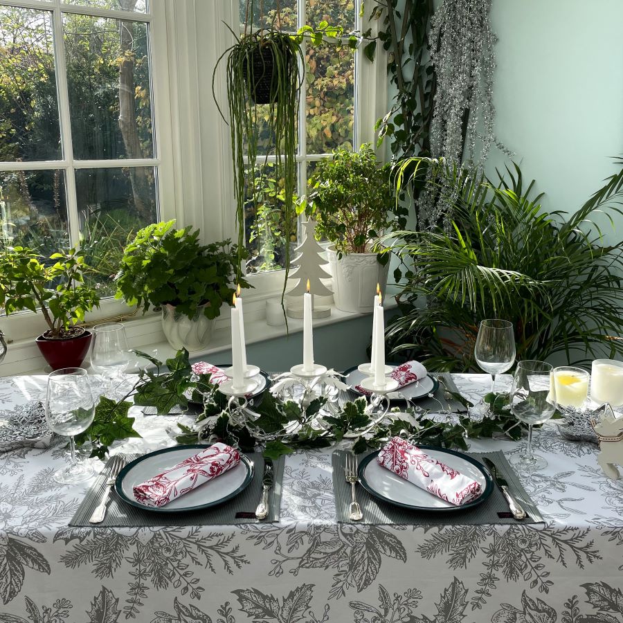 Our Christmas tablecloth is perfectly sized for a large dining table. Because it measures 230cm x 140cm which is to fit approx a 7 ft table.It is designed in a beautiful crisp white cotton with a rich red printed engraved style detail.