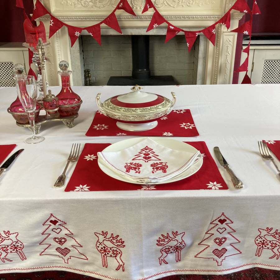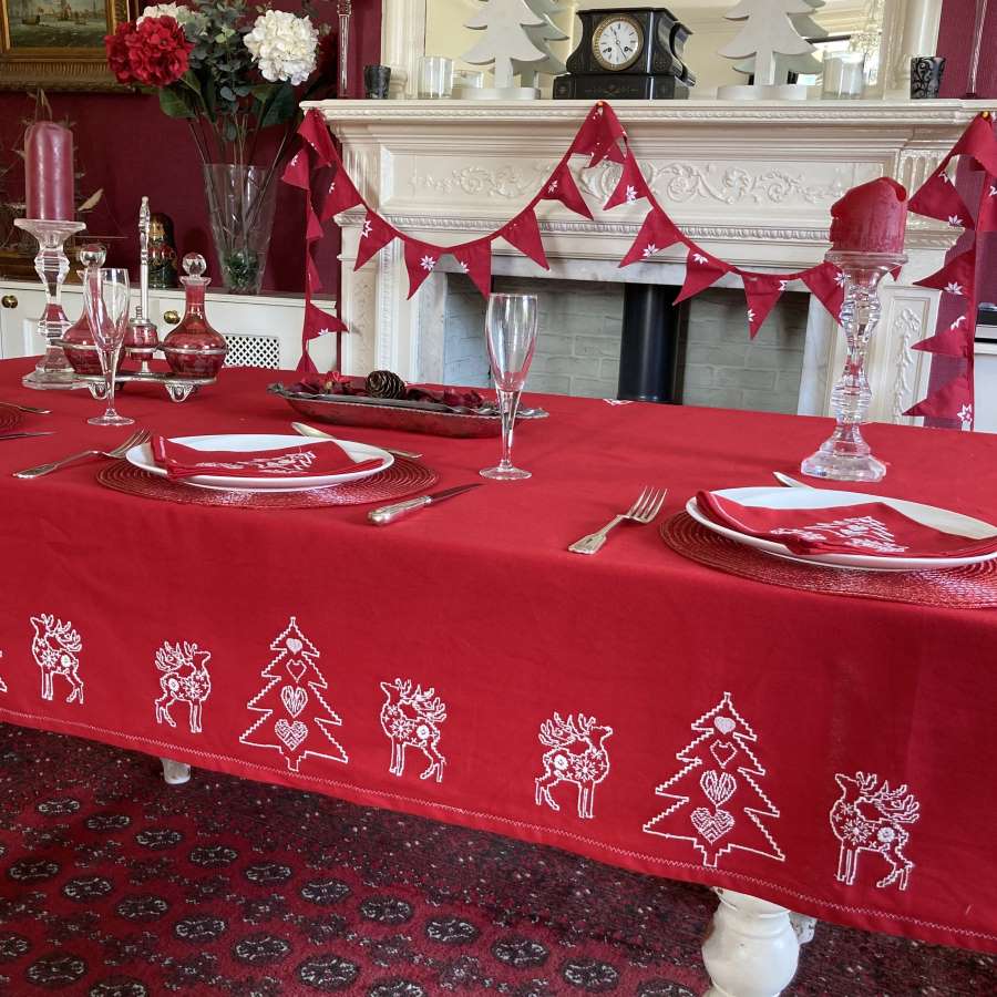 This embroidered Christmas tablecloth design is available in 3 stunning colourways